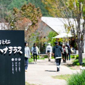 緑や花いっぱいの敷地内には、山梨県産のスイーツや おみやげ、和の雑貨を取り扱う店舗などが並びます。