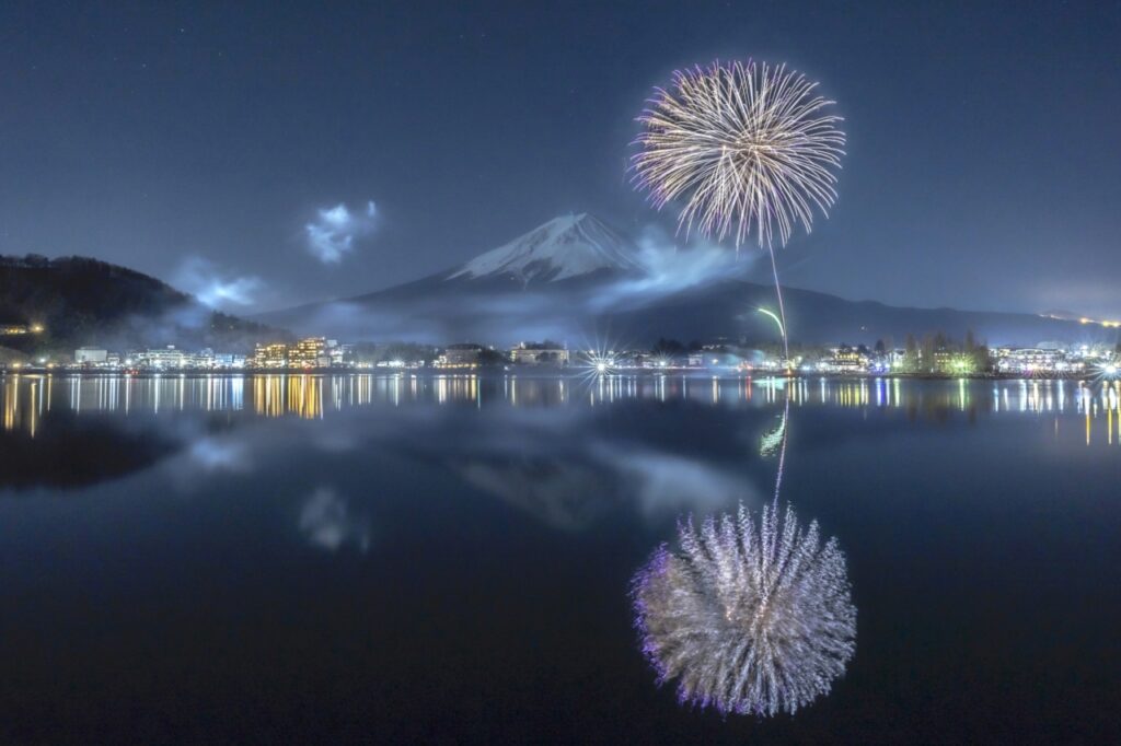世界遺産である富士山を背景に打ち上がる花火は、まさに絶景です。この時期にしか見られない、冠雪した富士山×花火という、特別な日本の風景を心ゆくまで楽しめます。