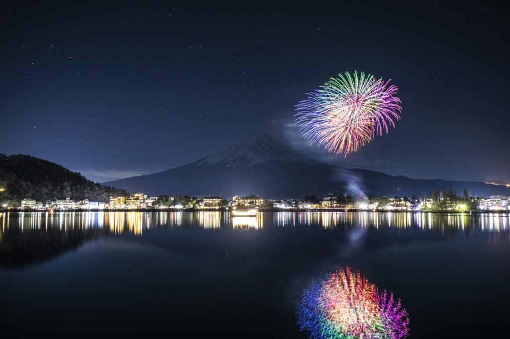 静かな湖面に花火の光が映り込み、「逆さ花火」として幻想的な世界を創り出します。水面と夜空、両方で花火の輝きを体験できるのは、河口湖ならではの魅力です。