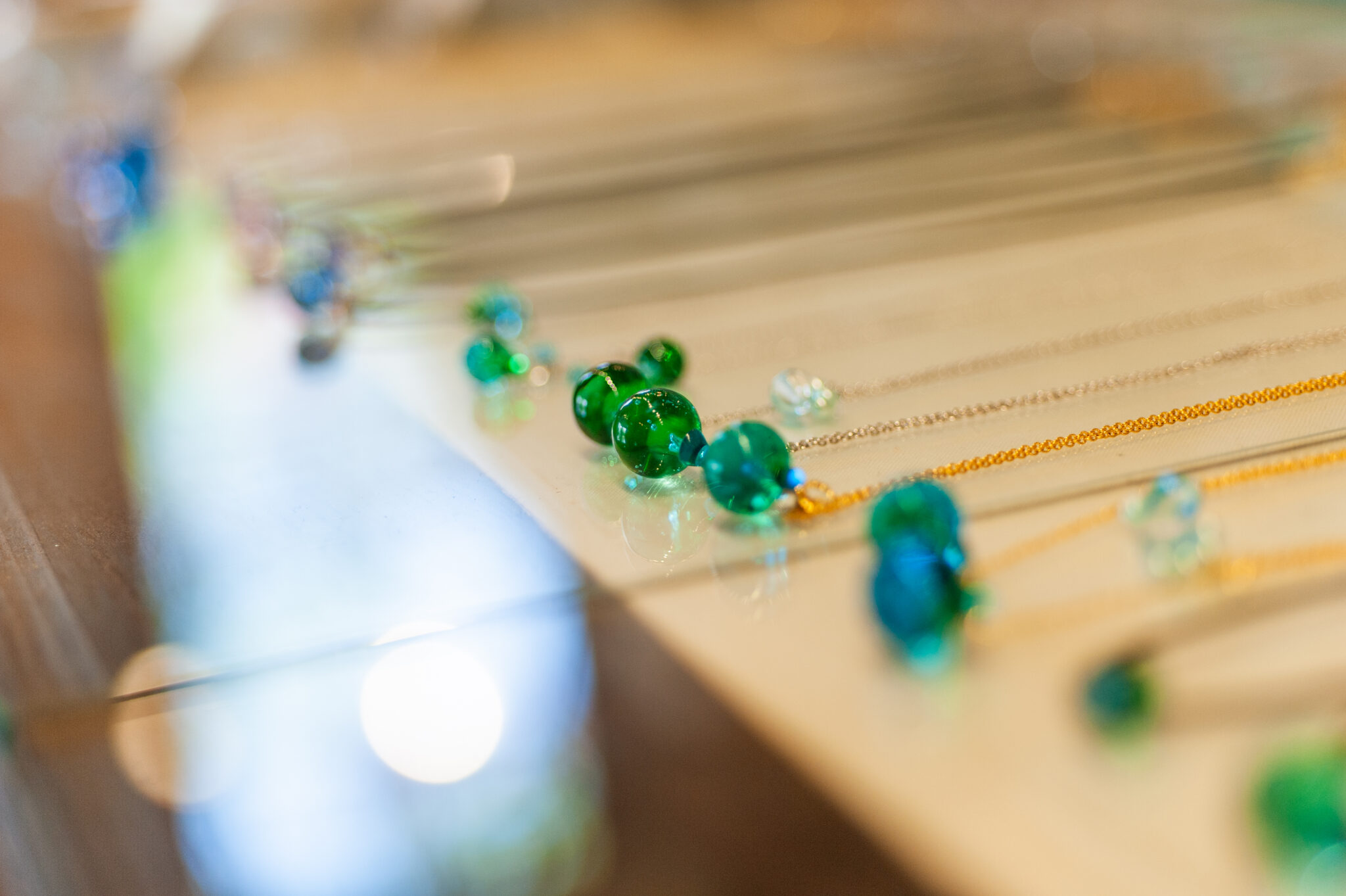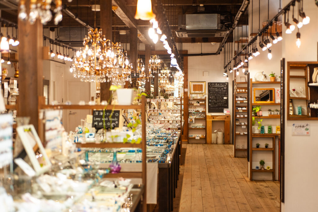 店内はアンティークな雰囲気に包まれ、天然石やガラスなど多彩な素材を使ったアクセサリーや雑貨が並びます。可愛らしいガラス製のねこ玉やいぬ玉をはじめ、ガラスや天然石を使ったアクセサリーが豊富に揃い、雑貨やパワーストーンも楽しめます。富士山モチーフの根付や箸置きも人気です。花火のように色とりどりに輝くガラスや天然石のアクセサリーを、旅の思い出にぜひ手に取ってみてください。