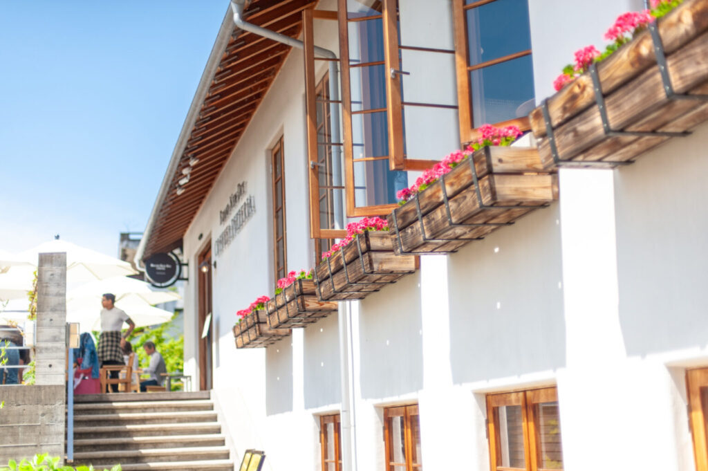 河口湖の北岸、大石公園に隣接する「富士大石ハナテラス」は、富士山と湖の景色を眺めながら、ゆったりとした時間を過ごせる場所です。 白い壁の建物が並ぶ敷地内には、機屋さんから生まれたファクトリーブランドを取り扱うショップも!また、山梨県産のフルーツを使ったスイーツやこだわりの雑貨を扱うおしゃれなカフェやショップもあります。 “ハタオリマチ”巡りの後に立ち寄って、景色を楽しみながらお茶をしたり、お土産を探したりするのにぴったりです。